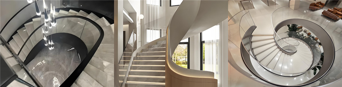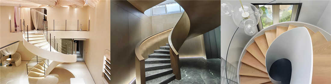 整体线条呈流畅的钝角弧线,没有全旋转楼梯的复杂曲率,也没有直线楼梯的呆板感,可适配多种装修风格。搭配钢化玻璃扶手+不锈钢龙骨,能打造现代极简风;搭配实木踏步+铁艺栏杆,可营造复古轻奢风,还能通过加装灯带,成为空间的视觉焦点。