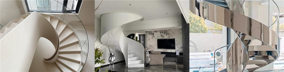 - **定制性强**:可根据层高、空间尺寸、承重要求调整旋转半径、踏步宽度,甚至可做“悬浮式玻璃踏步”(无明显龙骨),进一步强化极简质感。